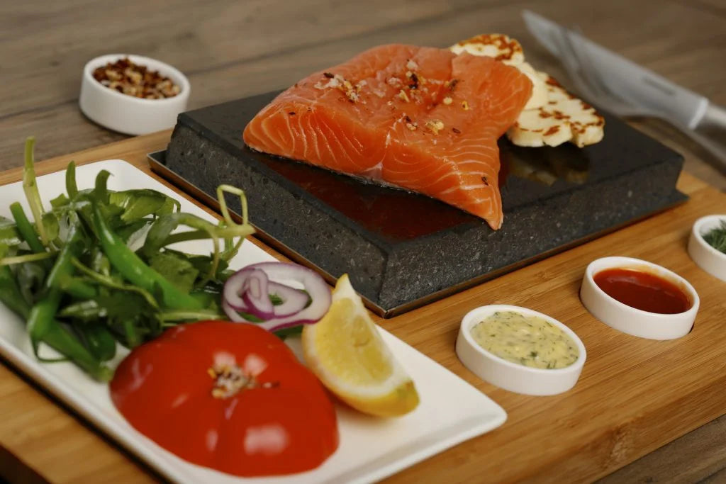 A lovely fillet of Salmon is absolutely delicious when cooked on the stone and one of our own favourites. Our preferred method is to heat the Lava Stone to around 300c and then place the Salmon Fillet skin down on the stone.